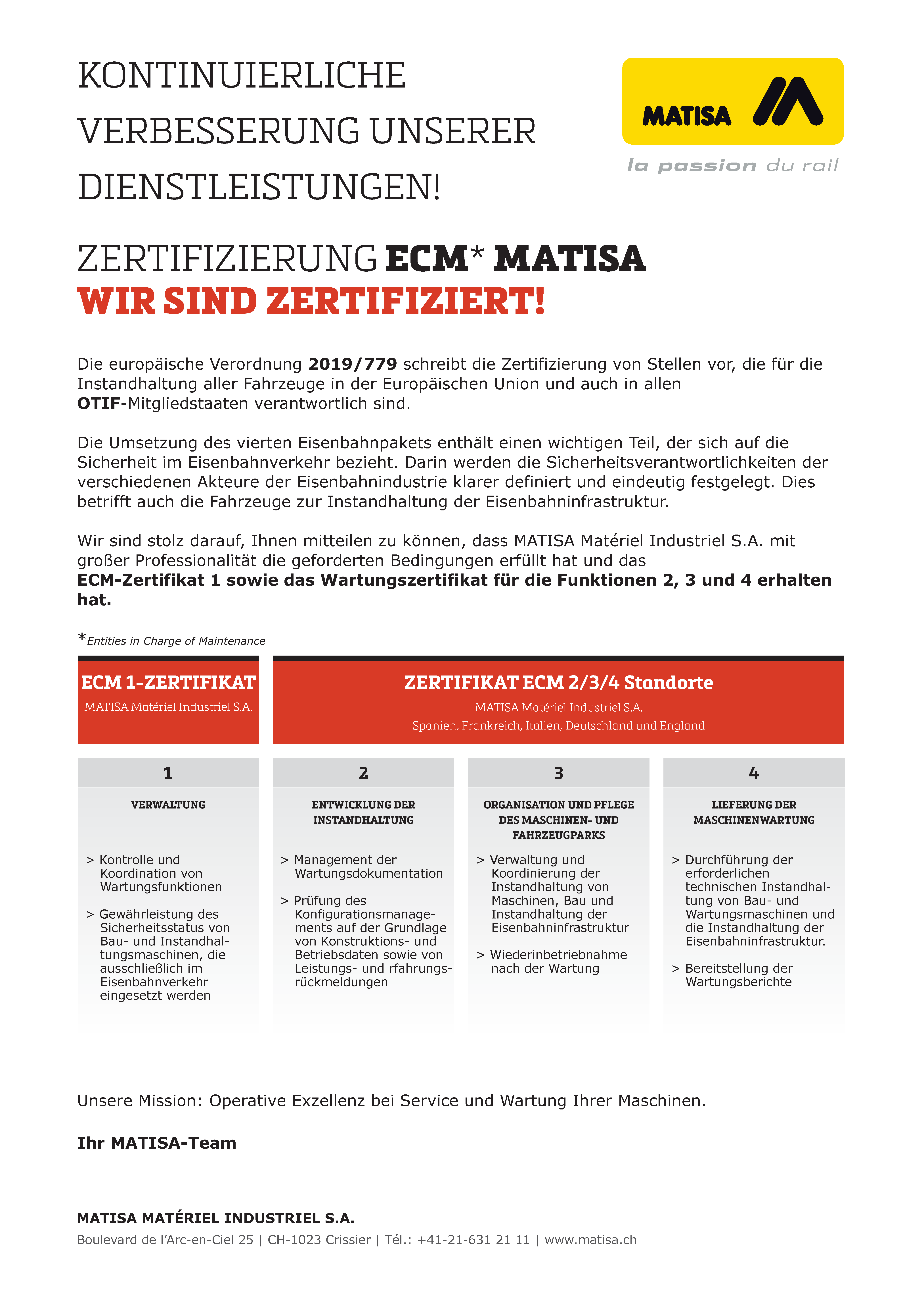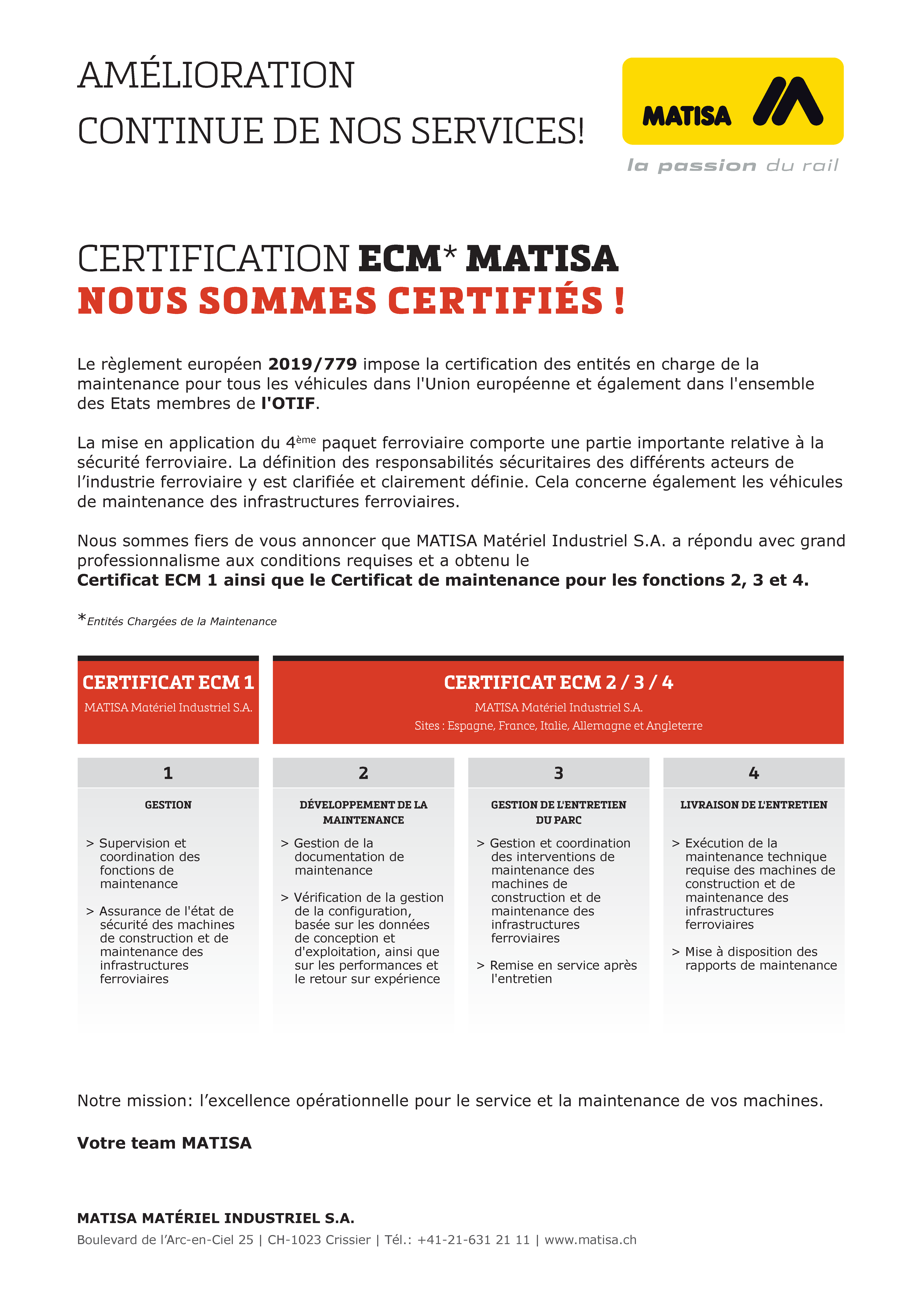 Depuis toujours à l’écoute de nos clients, les machines d’entretien ferroviaire MATISA répondent aux exigences les plus pointues en termes de qualité, fiabilité et sécurité.