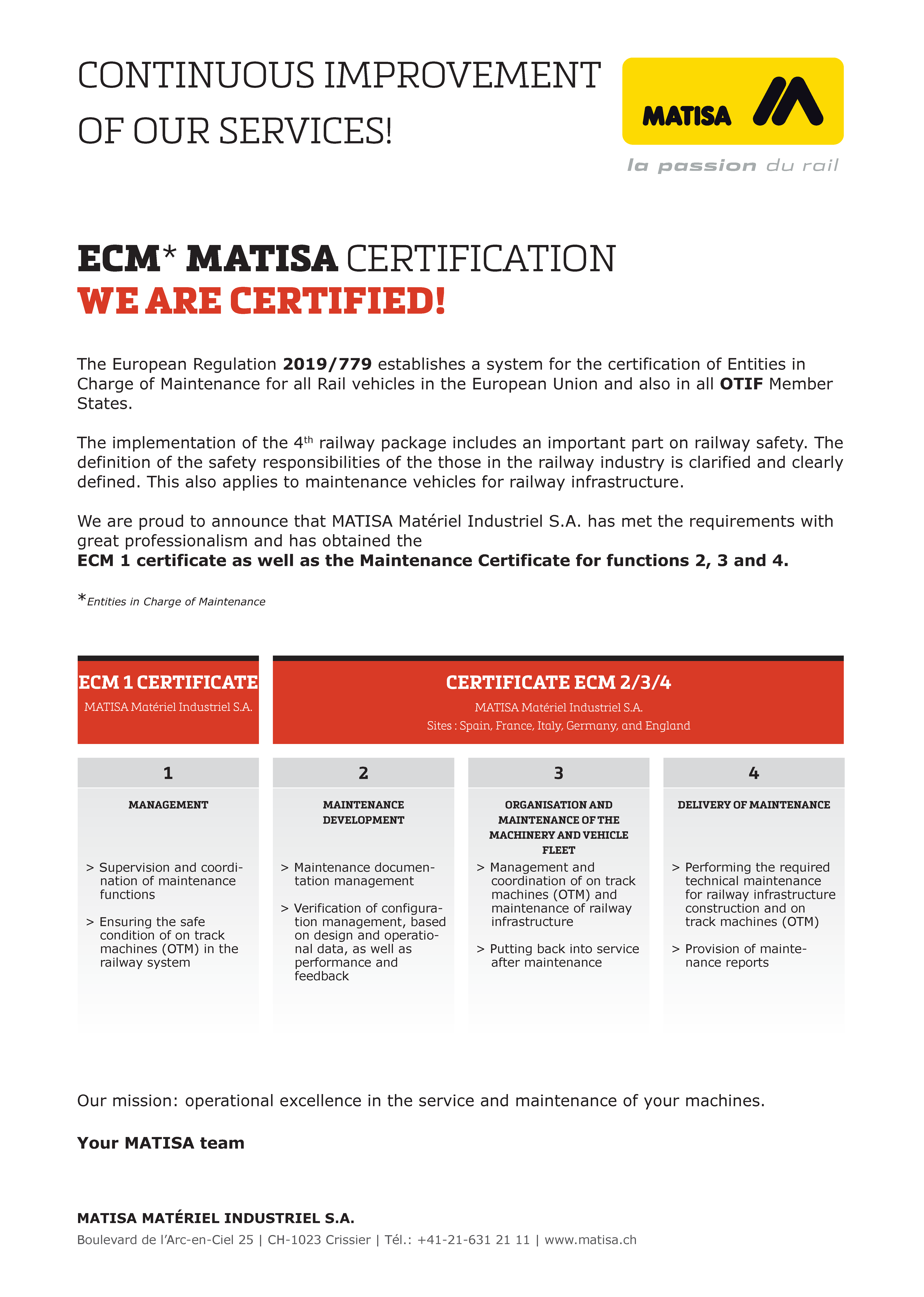 L’étroite collaboration entre nos ingénieurs de développement et nos concepteurs basée sur les informations continues véhiculées par nos responsables de marchés, nous permet de répondre aux besoins en permanente évolution de l’industrie du Rail. Une qualité suisse à la mesure des attentes des acteurs du secteur ferroviaire est privilégiée par une production locale qui regroupe tous les métiers spécialisés liés à ces produits. La proximité du bureau technique et de la production sur un même site favorise une excellente communication, des contacts permanents et garanti une finition et précision optimale du produit.